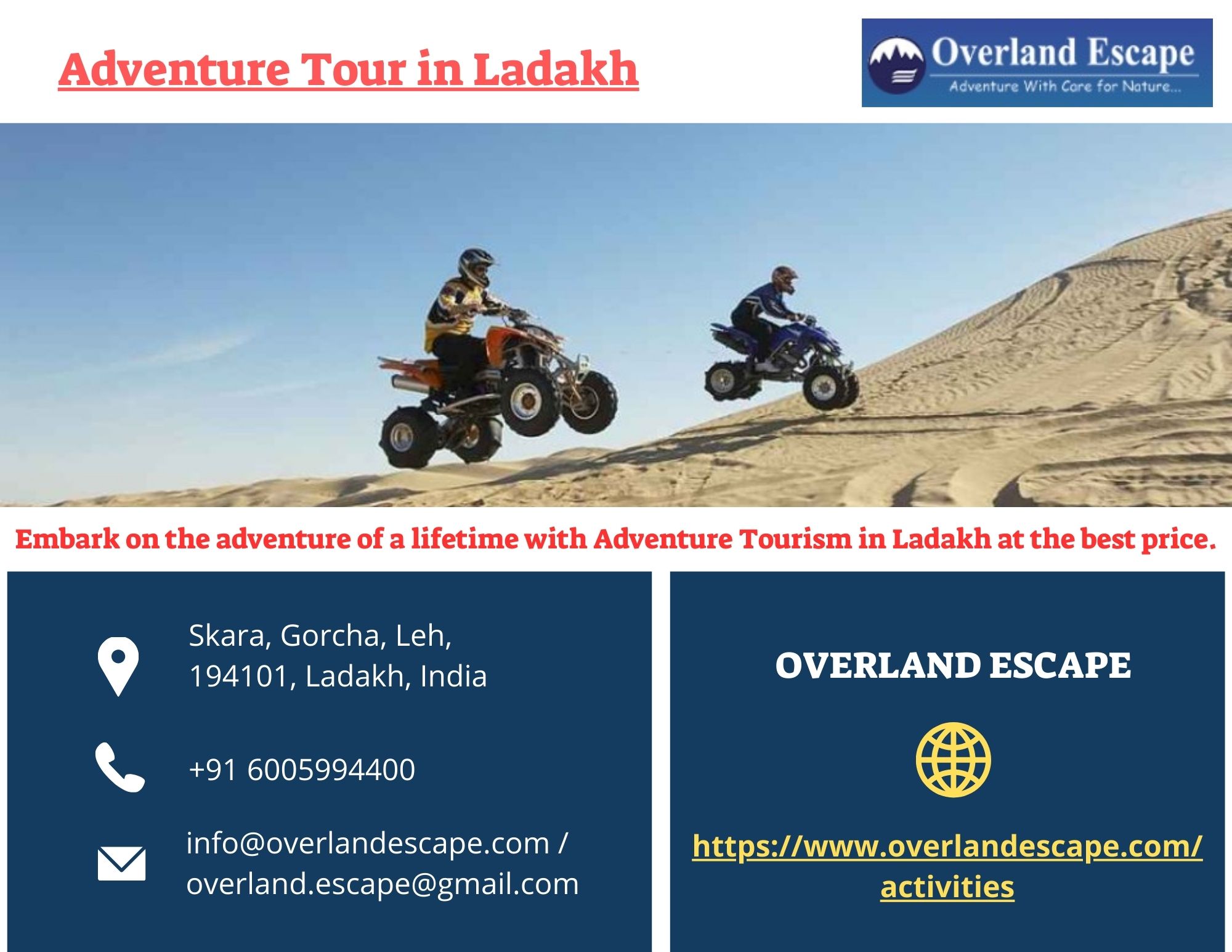 | Descripción | Enjoy the Adventure tour in Ladakh with Overland Escape. Overland offers an array of adrenaline-pumping activities including trekking, river rafting, mountain biking, and wildlife safaris. Our experienced guides ensure your safety while you explore Ladakh’s breathtaking scenery and hidden gems. Whether you're an adventure enthusiast or a nature lover, Overland Escape has something for everyone.... |