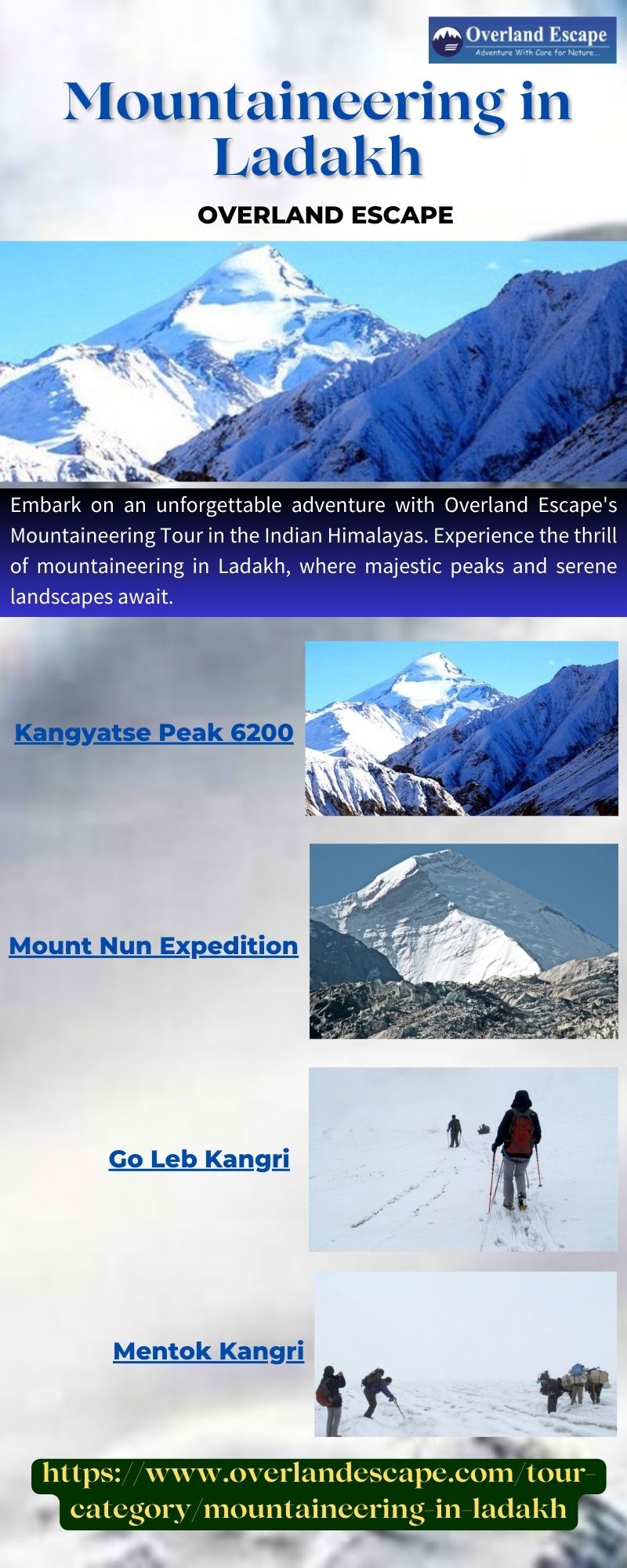 | Descripción | Embark on an unforgettable adventure with Overland Escape's Mountaineering Tour in the Indian Himalayas. Experience the thrill of mountaineering in Ladakh, where majestic peaks and serene landscapes await. Our expert guides ensure a safe and exhilarating journey, perfect for both novice climbers and seasoned mountaineers. Book your tour now and discover why Ladakh is a mountaineer's paradise. T... |