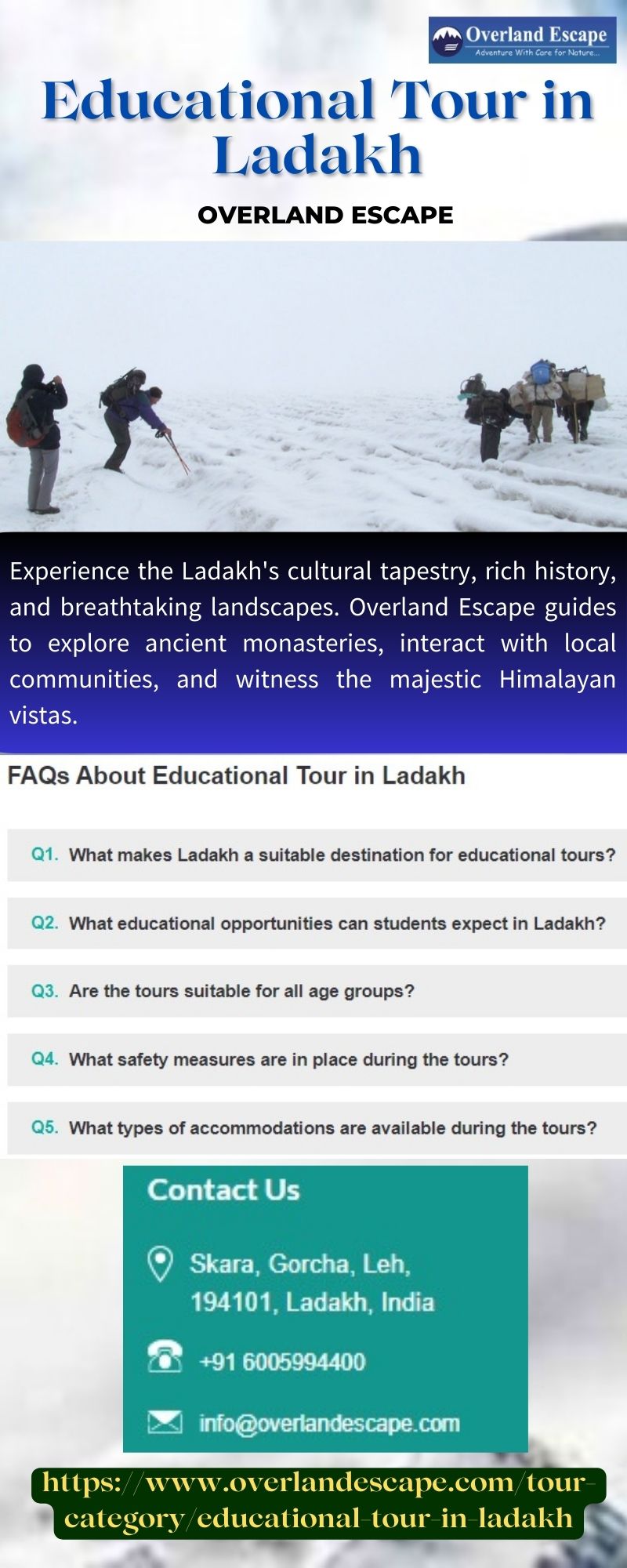 | Descripción | Experience Ladakh's cultural tapestry, rich history, and breathtaking landscapes with an Educational Tour in Ladakh. Overland Escape guides to explore ancient monasteries, interact with local communities, and witness the majestic Himalayan vistas. Our tour packages for students in Leh Ladakh are designed to cater to the specific educational needs and interests of young learners. Don’t miss out ... |
