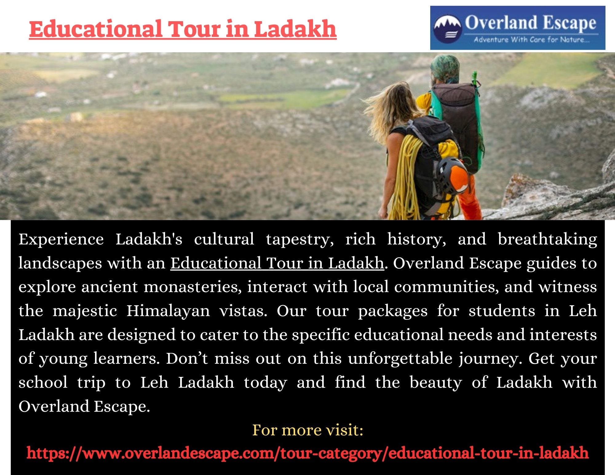 | Descripción | Experience Ladakh's cultural tapestry, rich history, and breathtaking landscapes with an Educational Tour in Ladakh. Overland Escape guides to explore ancient monasteries, interact with local communities, and witness the majestic Himalayan vistas. Our tour packages for students in Leh Ladakh are designed to cater to the specific educational needs and interests of young learners. For more visit ... |