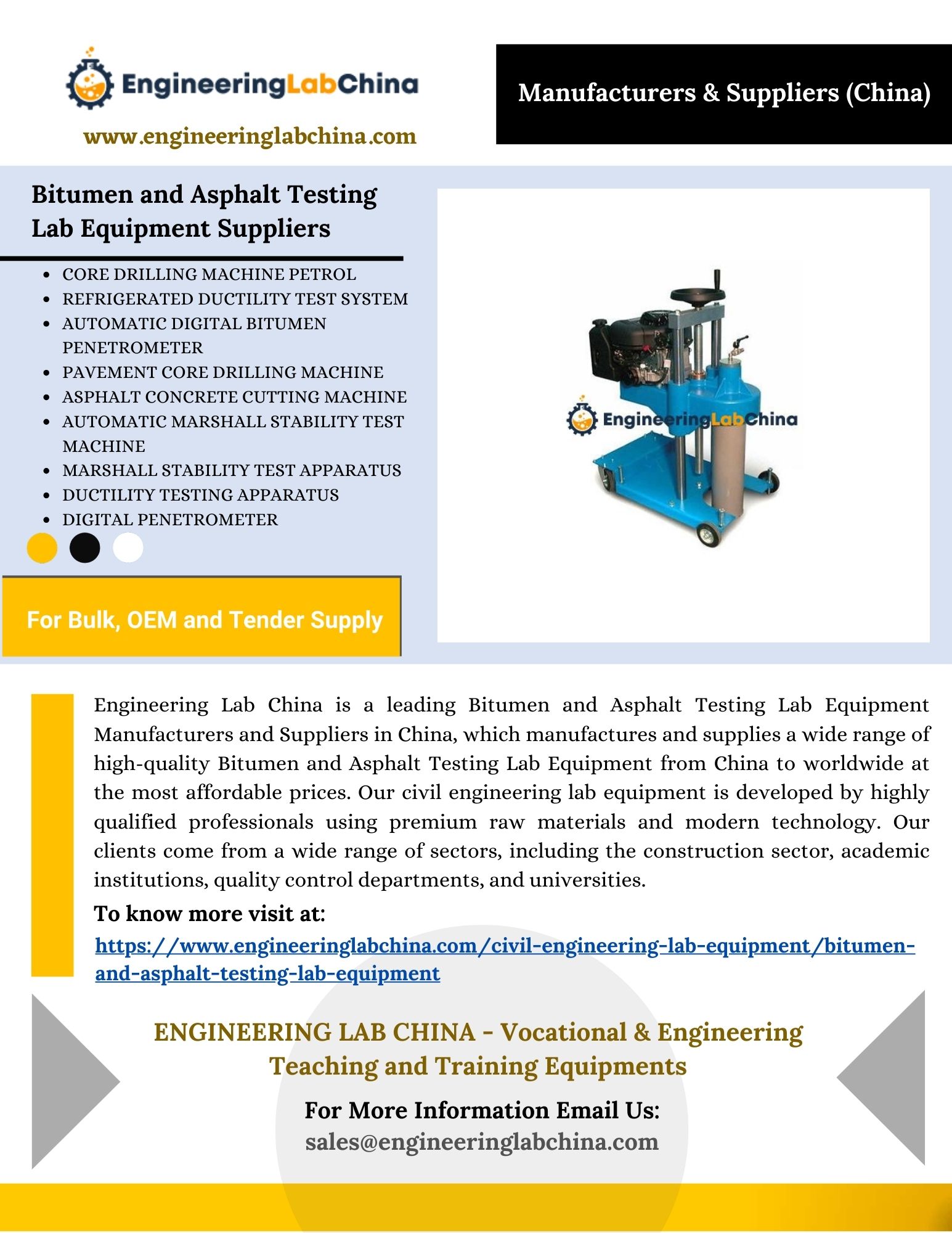 | Descripción | EngineeringLabChina stands out as one of the leading Bitumen and Asphalt Testing Lab Equipment Suppliers and Manufacturers, known for delivering quality, precision-engineered solutions tailored for civil engineering labs worldwide. With a commitment to excellence, EngineeringLabChina offers a wide array of testing equipment designed to meet the highest standards in bitumen and asphalt testing. ... |