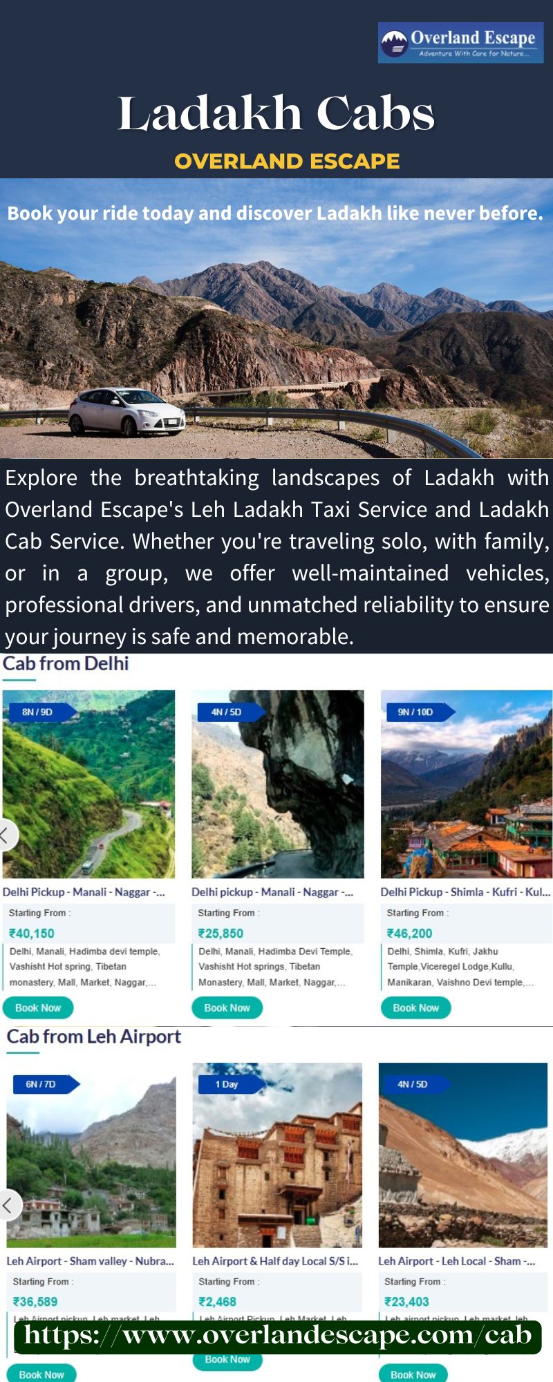| Descripción | Explore the breathtaking landscapes of Ladakh with Overland Escape's Leh Ladakh Taxi Service and Ladakh Cabs Services. Whether you're traveling solo, with family, or in a group, we offer well-maintained vehicles, professional drivers, and unmatched reliability to ensure your journey is safe and memorable. Our taxi service is perfect for sightseeing, airport transfers, and exploring iconic desti... |