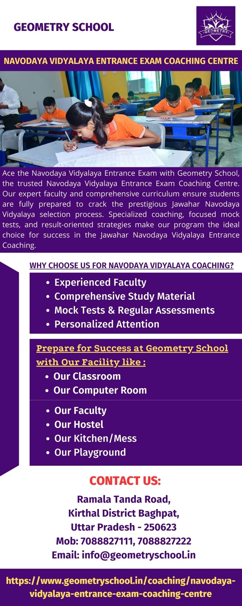 Descripción | Ace the Navodaya Vidyalaya Entrance Exam with Geometry School, the trusted Navodaya Vidyalaya Entrance Exam Coaching Centre. Our expert faculty and comprehensive curriculum ensure students are fully prepared to crack the prestigious Jawahar Navodaya Vidyalaya selection process. Specialized coaching, focused mock tests, and result-oriented strategies make our program the ideal choice for success... |