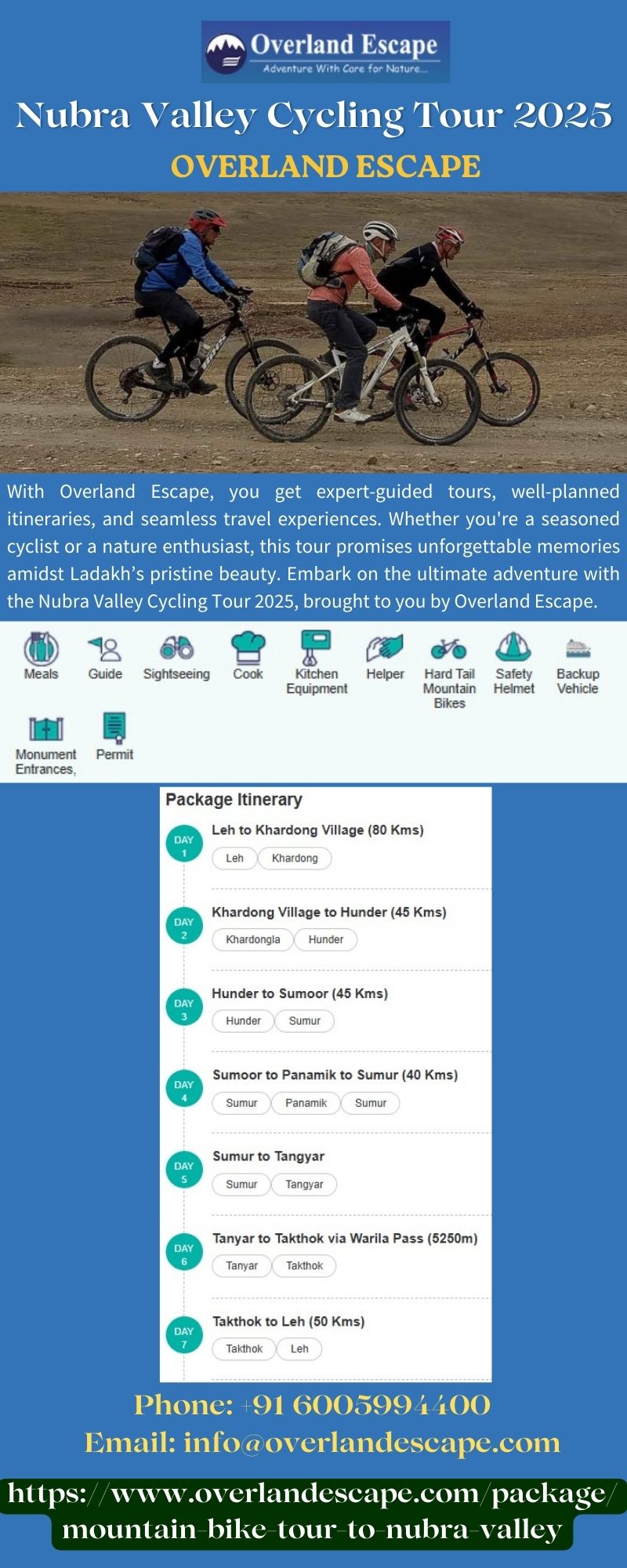 Descripción Embark on the ultimate adventure with the Nubra Valley Cycling Tour 2025, brought to you by Overland Escape. Our Cycling Tour Packages in Nubra Valley are crafted to offer a perfect blend of adrenaline and tranquility, showcasing picturesque sand dunes, ancient monasteries, and vibrant local culture. To know more visit https://www.overlandescape.com/package/mountain-bike-tour-to-nubra-valley