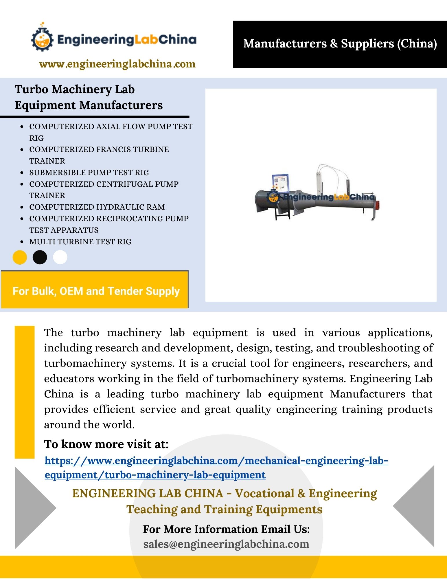 | Descripción | The turbo machinery lab equipment is used in various applications, including research and development, design, testing, and troubleshooting of turbomachinery systems. Engineering Lab China is a leading turbo machinery lab equipment Manufacturers that provides efficient service and great quality engineering training products around the world. Visit https://www.engineeringlabchina.com/mechanical-... |