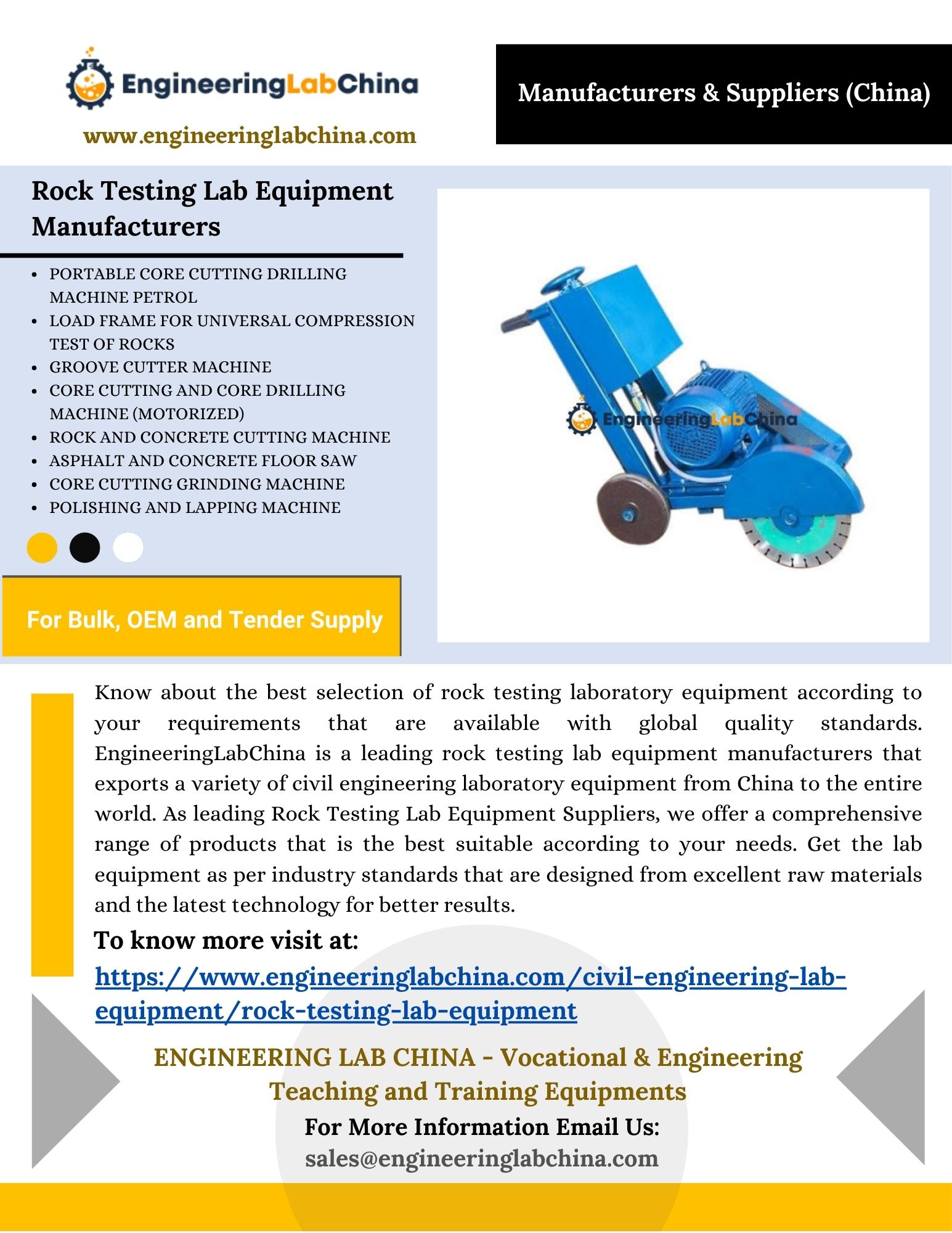 | Descripción | EngineeringLabChina is a leading rock testing lab equipment manufacturers that exports a variety of civil engineering laboratory equipment from China to the entire world. Get the lab equipment as per industry standards that are designed from excellent raw materials and the latest technology for better results. To know more visit https://www.engineeringlabchina.com/civil-engineering-lab-equipmen... |