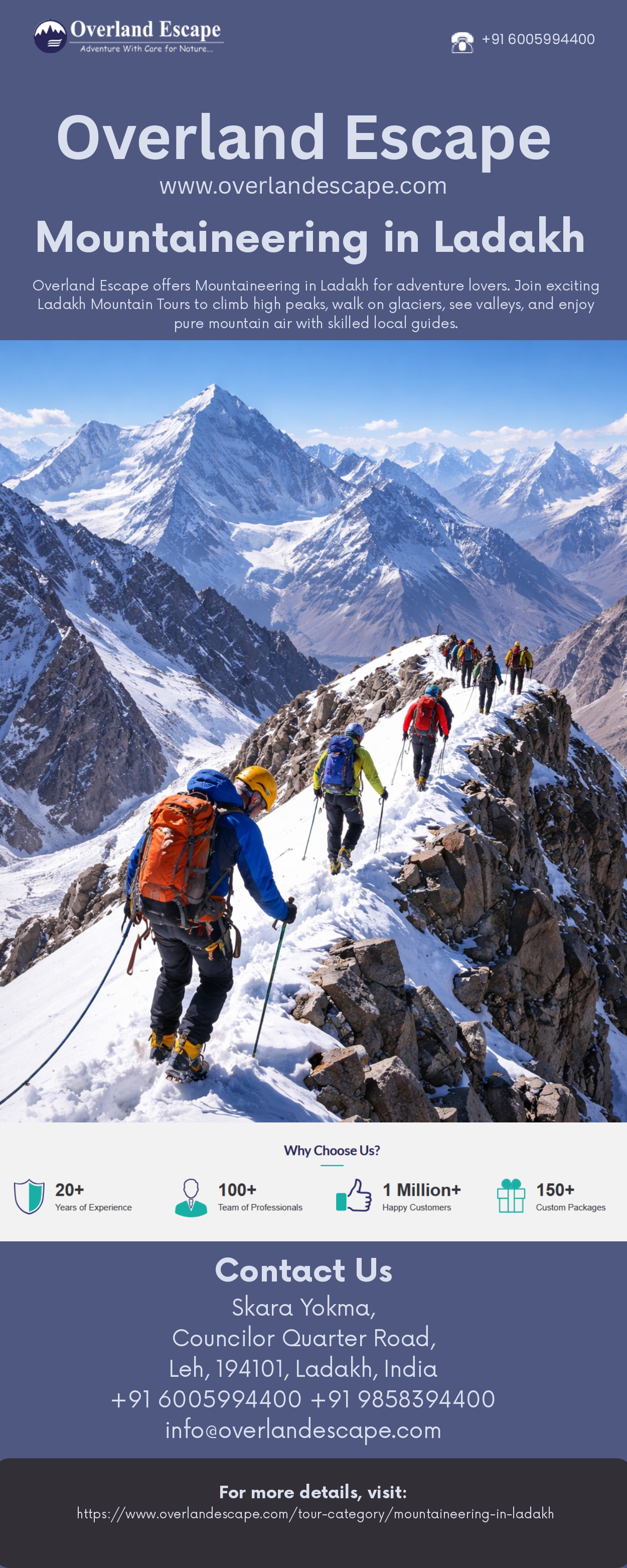 | Descripción | Explore Mountaineering in Ladakh with Overland Escape. Our simple, guided Ladakh Mountain Tours take you across high passes, icy peaks, and quiet valleys. Feel adventure, learn climbing basics, and enjoy Himalayan beauty. Enquire now! For more details, visit: https://www.overlandescape.com/tour-category/mountaineering-in-ladakh |